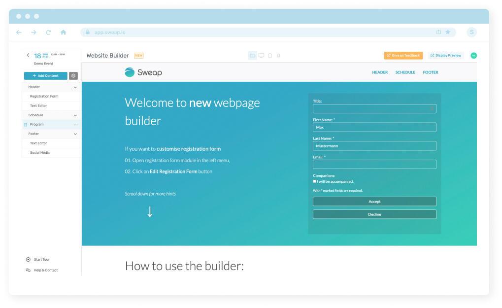 Vorbei sind die Zeiten frustrierender statischer Seiten, die keinen Raum für Flexibilität lassen. Vorbei sind auch die Zeiten hässlicher, unintuitiver Web Builder, in denen sich die Nutzer*innen in den schlecht erklärten, unübersichtlichen Optionen verlieren. Der Sweap Web Builder ist die perfekte Goldlöckchen-Lösung für vielbeschäftigte Event-Profis, die stolz auf ihre Arbeit sind.
