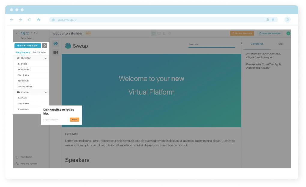 Er ist schön, er ist dynamisch, und egal, ob du ansprechende Seiten für die Event-Registrierung oder ansprechende virtuelle Event-Plattformen erstellen willst, unser neuer Web-Builder erfüllt alle deine Anforderungen.