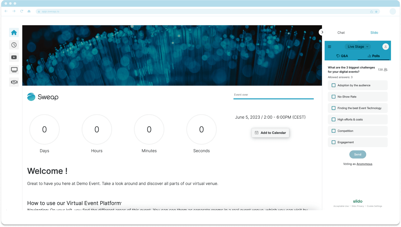 Slido seamlessly integrates into the Sweap Virtual Event Platform. With a Slido account, you can display interactive elements like Q&As, polls, or quizzes directly on your event platform. Learn more.