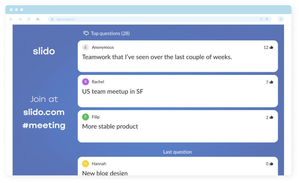 Slido offers a user-friendly interface for moderators and makes it easy to manage live questions and polls efficiently. Its integration with Sweap ensures a smooth and interactive event experience.
