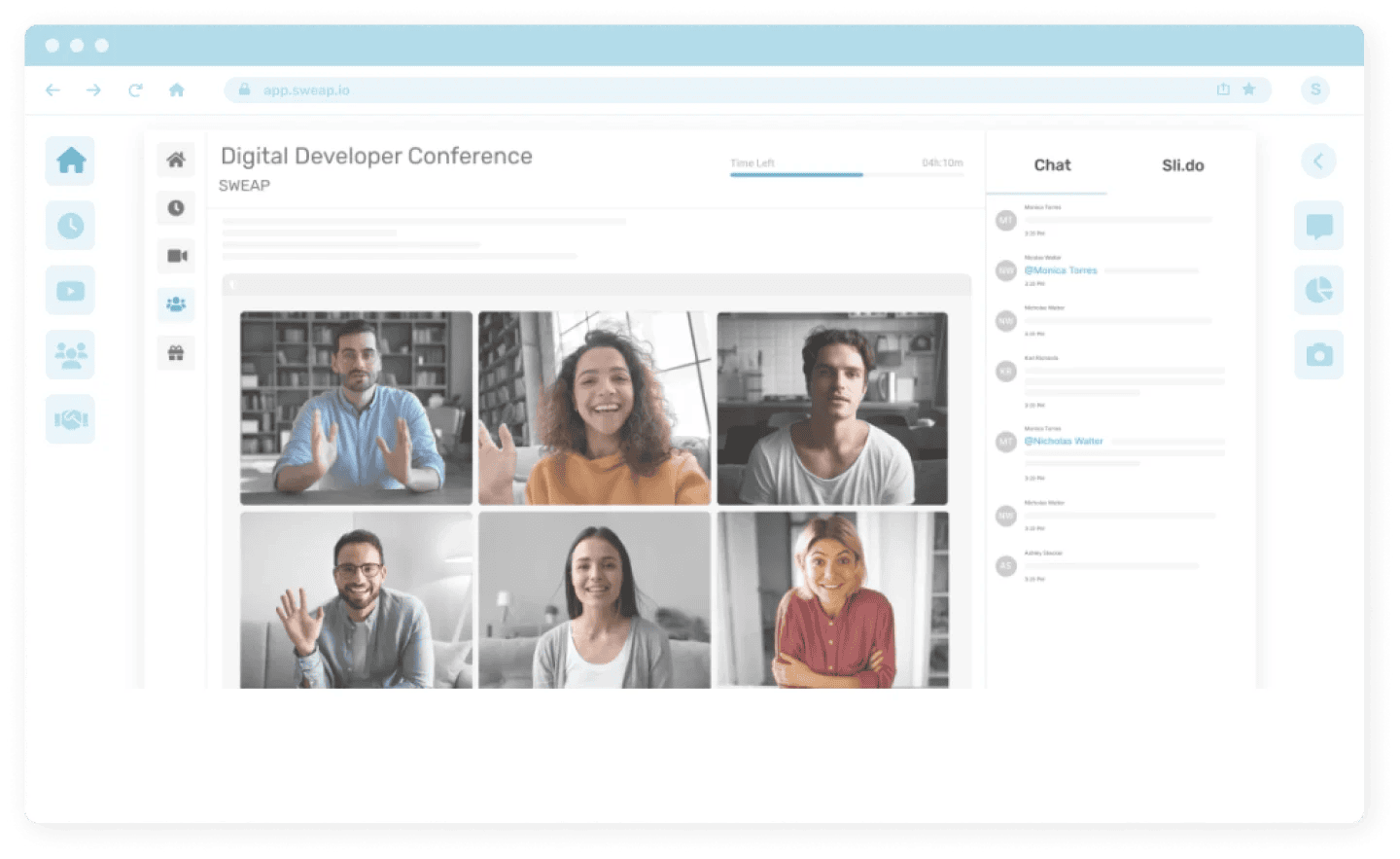 The Virtual Event Platform by Sweap is a user-friendly all-in-one solution for virtual and hybrid events. It brings together livestreams, breakout sessions, chats, polls, and other interactive modules in one centralized platform – seamlessly integrated and fully customizable. Its goal: to create unforgettable virtual experiences and actively foster participant engagement. Thanks to its open architecture, it connects with all leading event tools and meets the highest standards in data protection and operational efficiency.