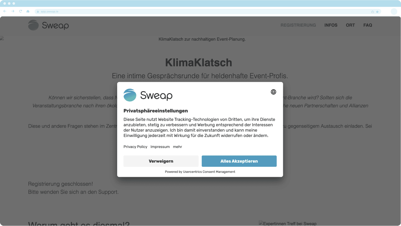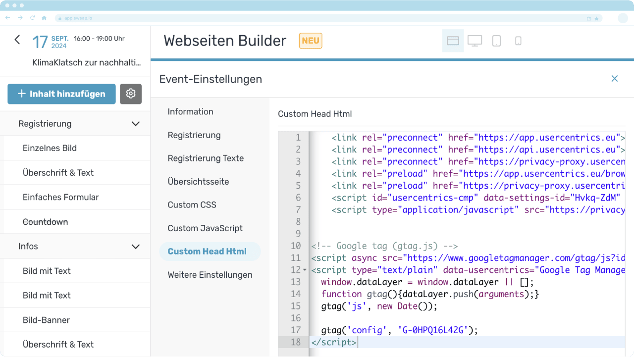 Leveraging the right tools, like Sweap’s Event Management Software, can make this process even more seamless. Sweap offers integrated SEO features and the option to connect your Google Analytics account and a GDPR-friendly consent banner to ensure your event is optimized from every angle. Staying agile and informed through ongoing analysis will help you adapt to search trends and keep your event visible in a crowded online space.