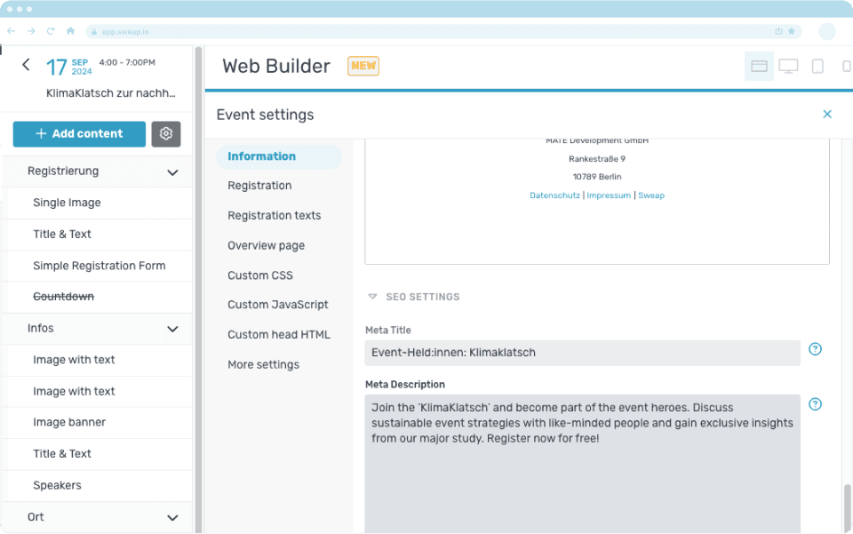 Incorporating SEO-friendly tools into your event planning software not only saves time but also ensures your website ranks well, driving organic traffic and enhancing the chances of success for your event. With Sweap, you can easily add essential SEO information to your event registration pages, including meta descriptions and keyword optimization. Plus, Sweap’s dynamic Web Builder helps you create the most SEO-friendly version of your registration pages, ensuring your event is both visible and accessible to your target audience.